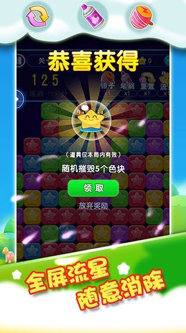 我想消除星星。游戏玩家还可以使用道具引爆星星,然后快速收获奖励。
