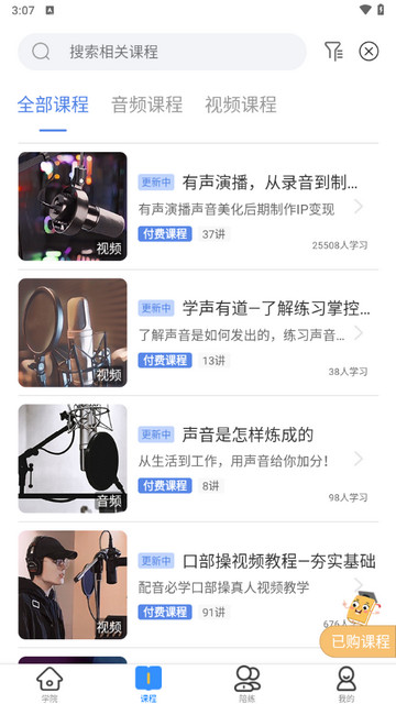 在“配音圈兼职”APP里实习,虽然不能跟棚,但是花费少。买会员可以练全站素材,几十块或者几百块就可以得到专业配音人员和配音大咖的点评,很经济。
