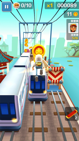3、在火车旁边迅速向火车划两下,可以进入火车。如果在火车的头那里划,你会停在那里,可以利用这个bug做任务,这个bug可以完成一局游戏跳多少下或者滚多少下,完成这个任务还是很容易的。