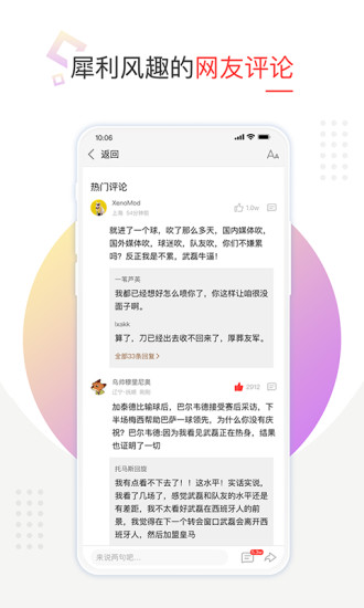 海量快速全面的新闻报道及深度评论;视频新闻涵盖集锦、录播、策划、进球等10余种类型,丰富多彩的视听享受。