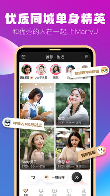 marry u为有明确结婚计划的优质单身人士提供一个高品质征婚相亲的婚恋平台, 全新的实名制认证交友模式,让会员的交友 环境有一个真实安全的保障。我们只做和你一样认真的专业婚恋平台。在MarryU,没有人会笑你太认真。所有会员都必须真实身份认证,让每一个缘分都真实无虚。