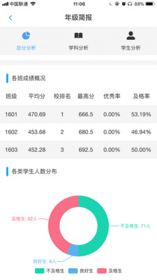 2、【班级报告】:以班级为单位,用户可自由切换“全科”和“单科”两个维度,查看班级考试报告,报告通过“分数段”“三率一分”“学科分析”“本版前十名”等模块体现,让老师更加了解学生学业情况,以便适度调整教学方法。